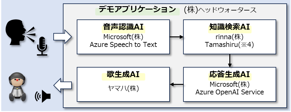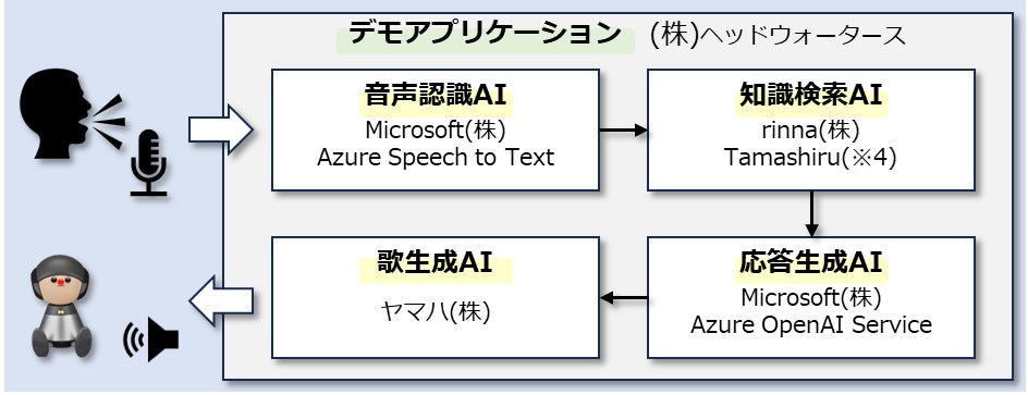 ヤマハ発動機は、ヤマハ株式会社がジャパンモビリティショー2023(※1)に展示するAIロボット「Charlie(チャーリー)」(※2)の会話AIを担当し、AI知識学習とキャラクターチューニングを実施しました。その工程において、ヘッドウォータースとrinnaは歌生成AI・音声認識AI・知識検索AI・応答生成AI(Chat GPT)を組み合わせたデモアプリケーションの開発支援を行いました。