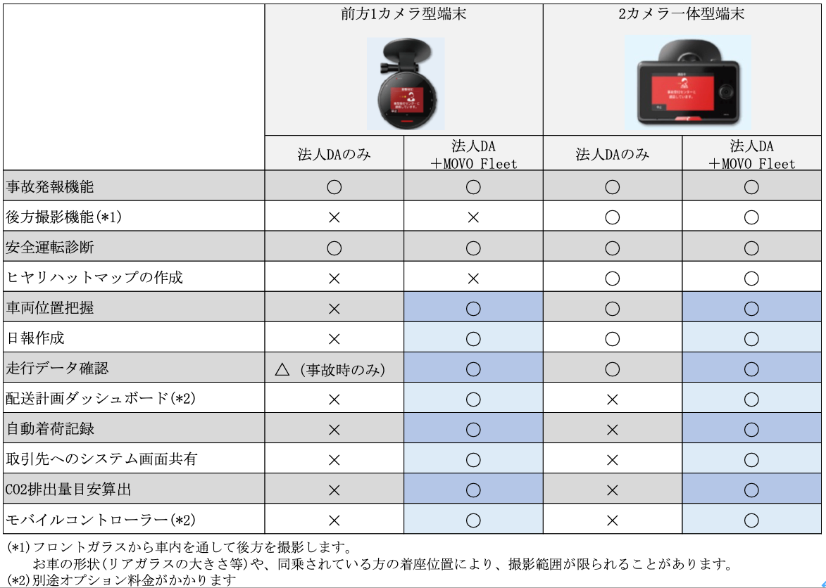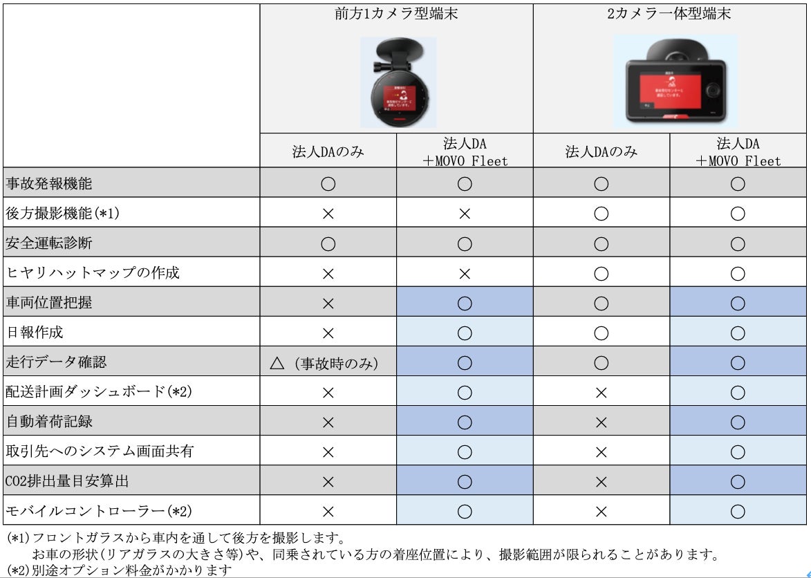 新サービスは、法人DAの機能に加え、下記に記載のMOVO Fleetの機能をご利用いただけるMOVO Fleet連携プランとなります。また、別途専用端末を設置することなく、法人DAで提供しているドライブレコーダーのデータが連携されることで、MOVO Fleetによる車両管理の効率化・配送状況の可視化機能を利用できます。