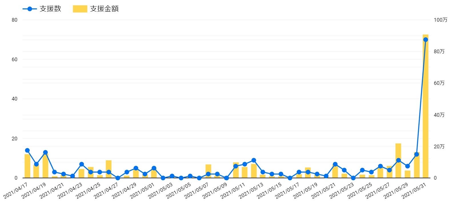 ・支援募集期間を通じた支援数(折れ線)、及び支援金額(棒線)