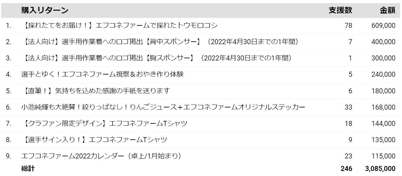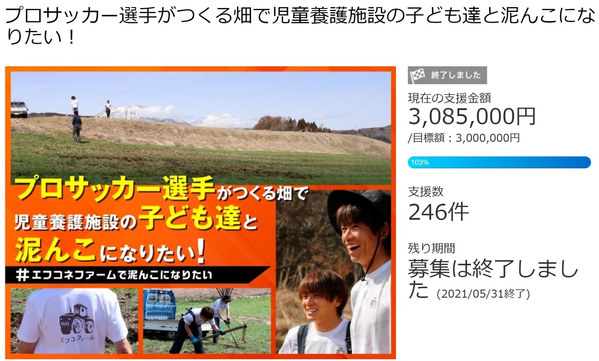 2021年4月17日に開始した『プロサッカー選手がつくる畑で児童養護施設の子ども達と泥んこになりたい!』は、300万円を達成し、最終的には支援数246件、支援金額308.5万円で終了いたしました。ご支援いただきました支援者の皆様には、多大なる温かいご支援をいただきましたこと、深く御礼を申し上げます。