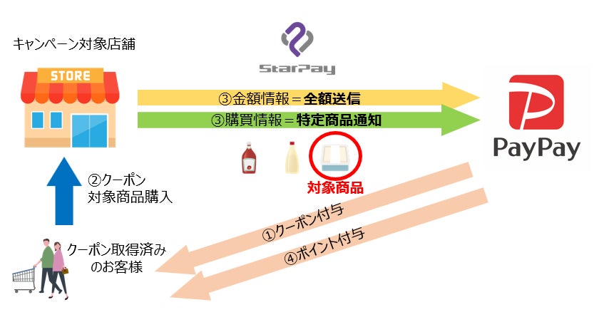 お客様はPayPayアプリより商品特定クーポンを事前に獲得します。対象のStarPay加盟店でクーポン対象商品を「PayPay」で購入すると、クーポンが適用され、後日ポイント付与されます。PayPayはStarPayから取得したデータを元に、クーポンやキャンペーン施策を行ったメーカー側へ効果測定などのフィードバックが行えます。