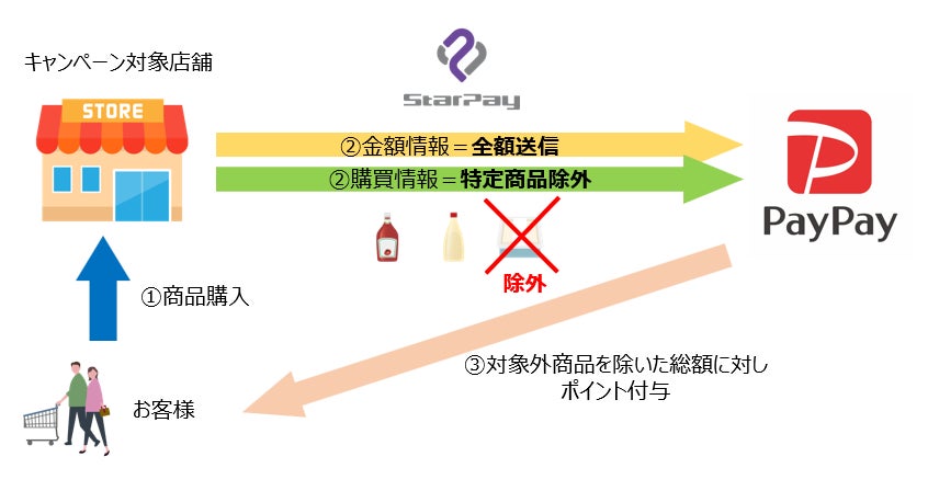 今回の機能開発により、PayPayはネットスターズが提供する管理画面からポイント付与対象外商品を選ぶことで、その商品情報を受け取る設定ができ、ポイント付与額の計算の際に対象商品分を除外できます。そのためポイント付与対象外商品を扱う店舗でも総額型ポイント付与キャンペーン・クーポンが利用可能になります。