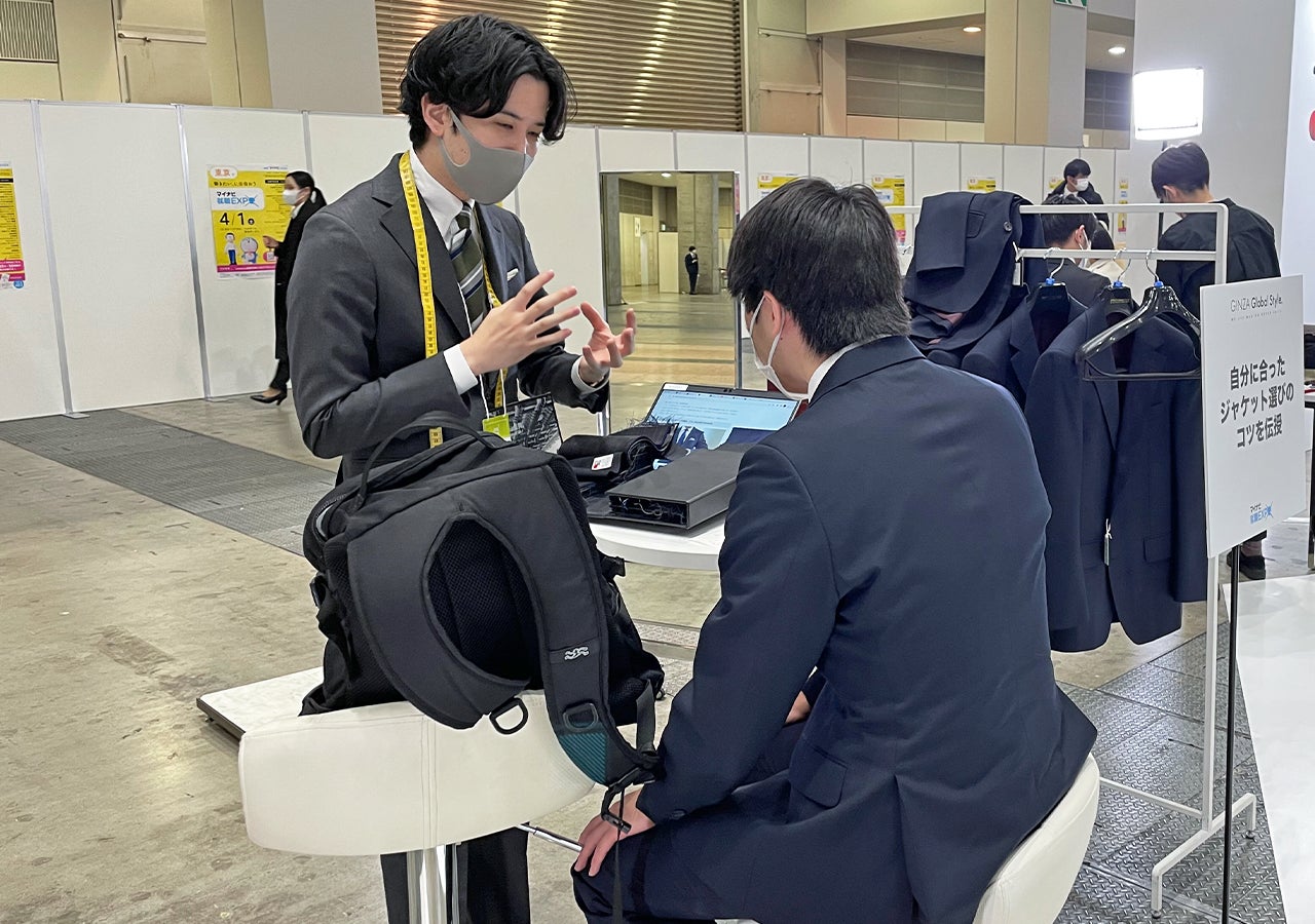 オーダースーツ専門店「GINZAグローバルスタイル」が新社会人向けにスーツの着こなし方や、オーダースーツの採寸を体験できるイベントをマイナビ就職EXPOで開催いたしました!