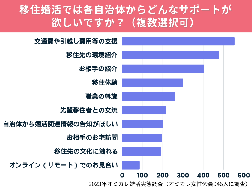 また、この2つの回答に加え、「交通費や引越し費用等の経済的サポート」を希望する婚活女性が多い傾向が見られています。