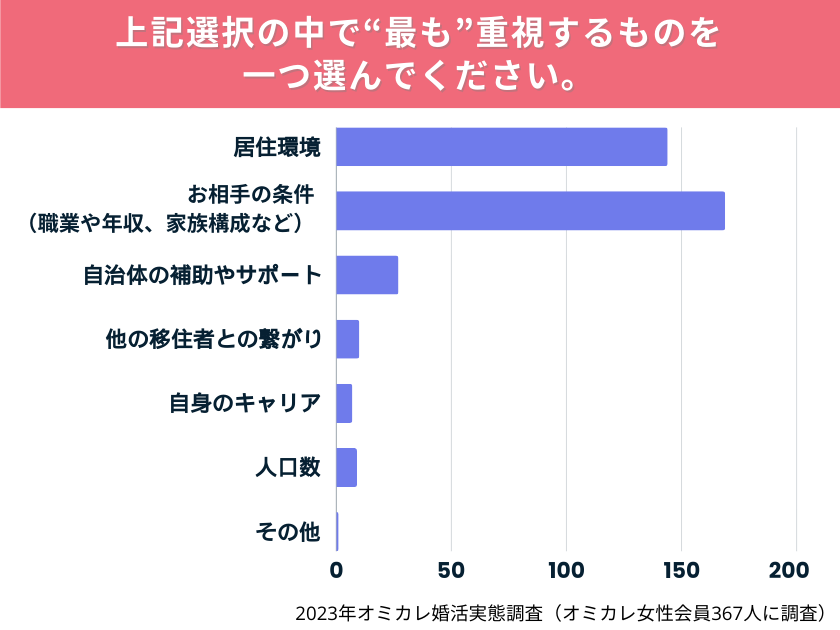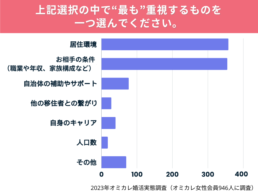 そして、続いてはこの中から、移住婚活において、「移住先で最も重視していること」を質問してみました。