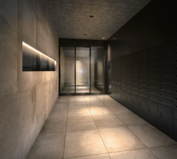 本物件のエントランスホールは高級感のある大理石調タイルをあしらい、やわらかな灯りがギャラリーのような落ち着いた迎賓空間を演出しています。