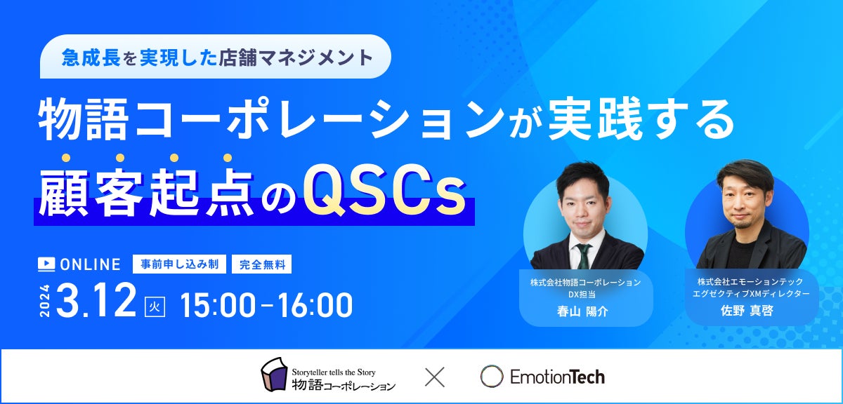 本サービスに関するオンラインセミナー「〜急成長を実現した店舗マネジメント〜 物語コーポレーションが実践する顧客起点のQSCs」を物語コーポレーションと共に開催いたします。ぜひご参加くださいませ。
