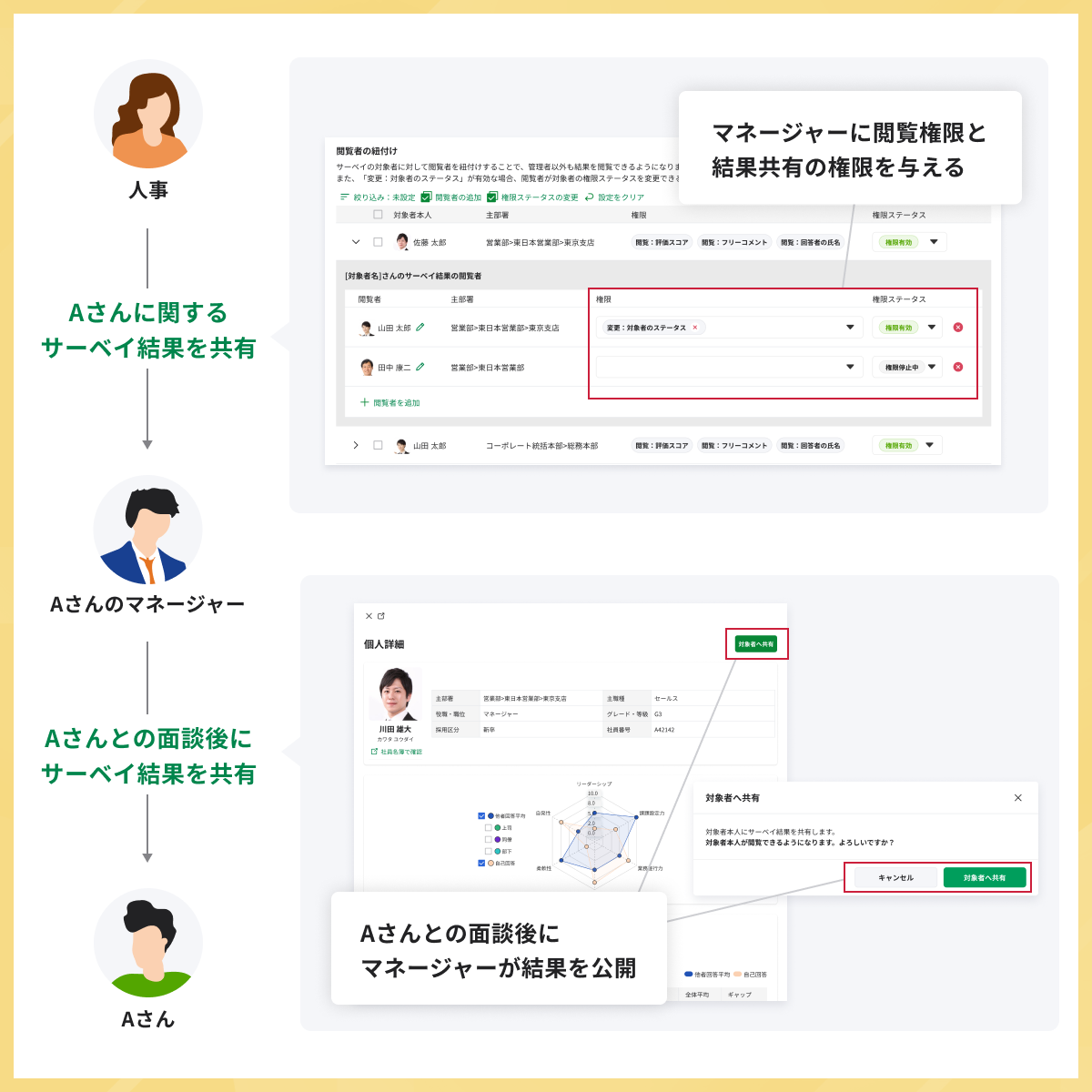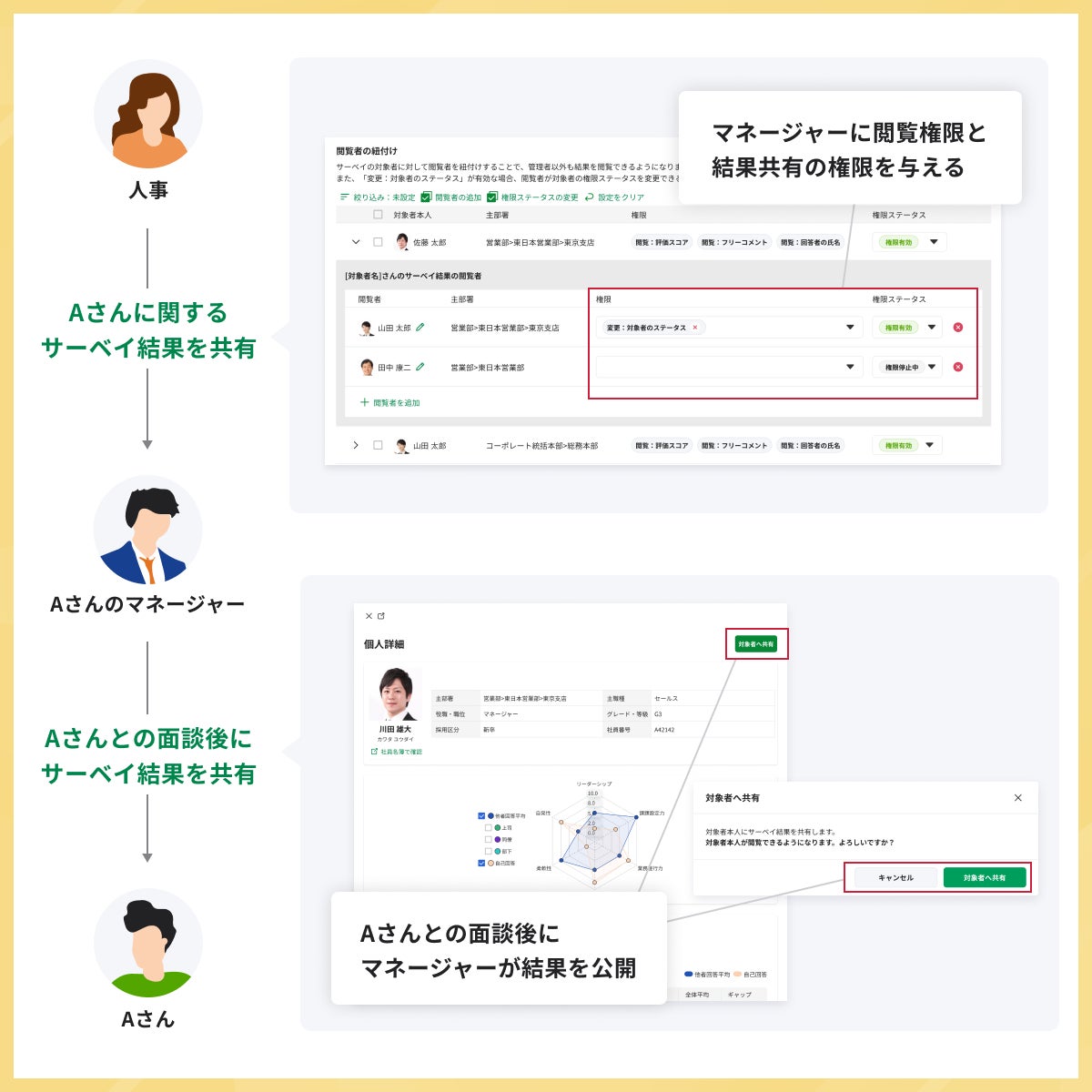 評価結果の閲覧設定を細かく設定し、安心した運用が可能です。