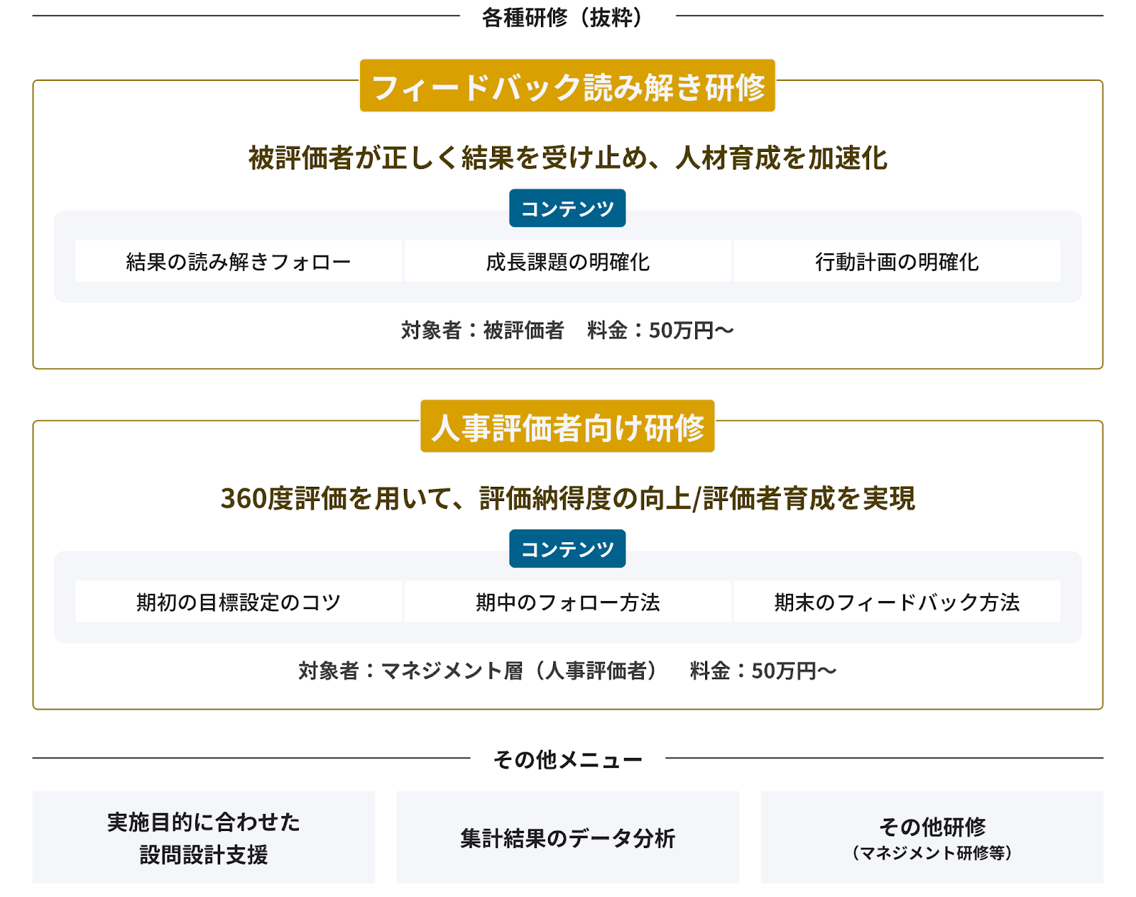 実施目的やご状況に合わせて、設問設計からデータ分析までを一気通貫で支援するコンサルティングや、人材育成を加速させる「フィードバック読み解き研修」など、スポットでの研修も支援可能です。※コンサルティング・研修は有料オプションです。