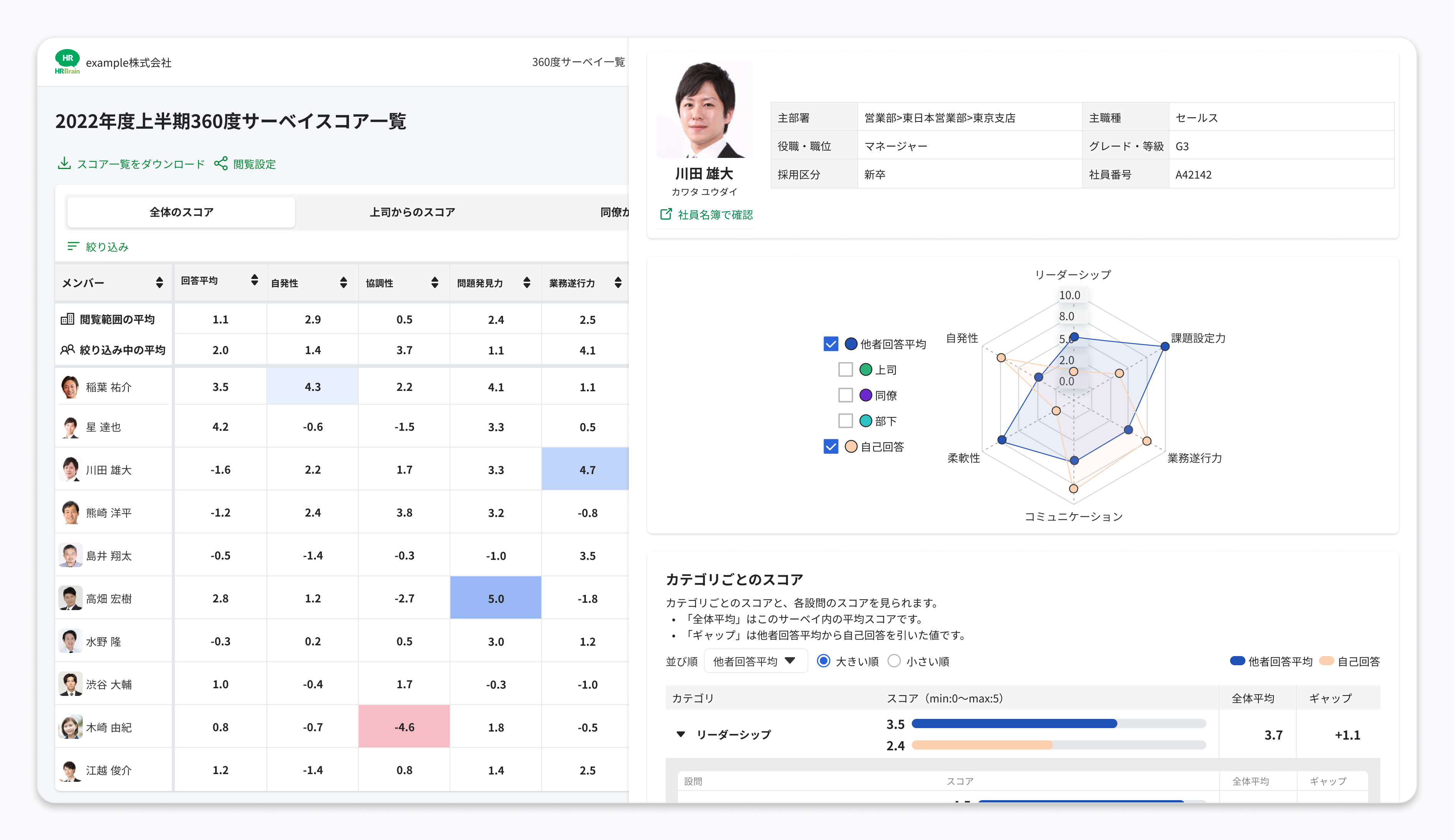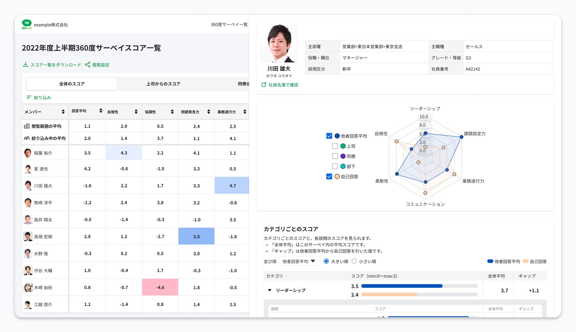 個人の結果を自動で集計し、自己と他者の認識ギャップをレーダーチャートやグラフで直感的に把握が可能。