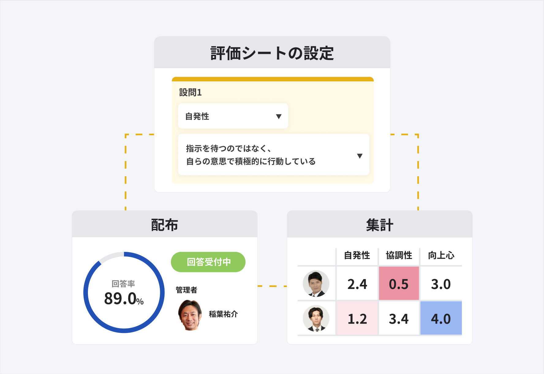 評価シートの設定や配布・集計までクラウド上で完結。未対応者への一括催促メールや設問テンプレートの利用で、初めての導入でもかんたんに使いこなせ、業務効率化が可能です。
