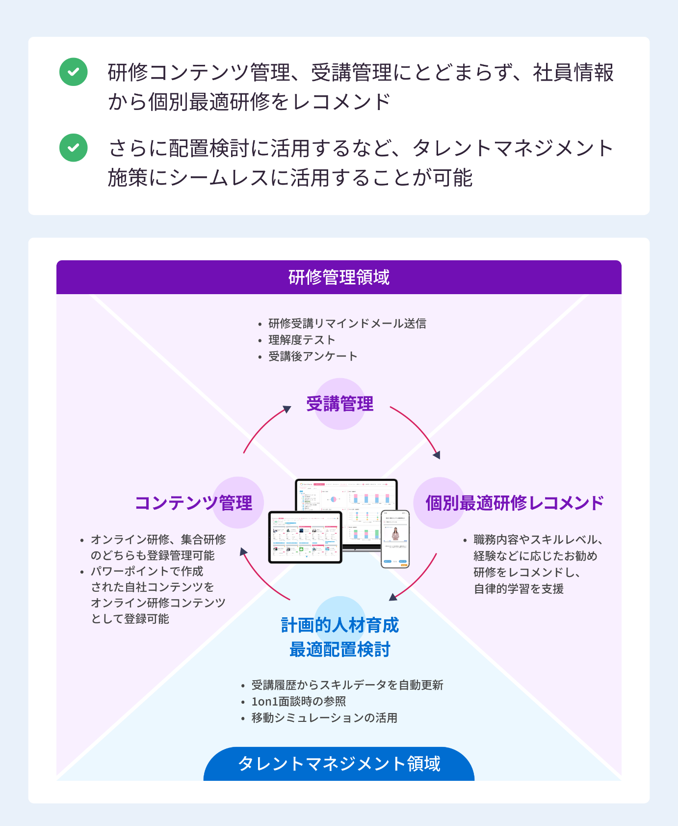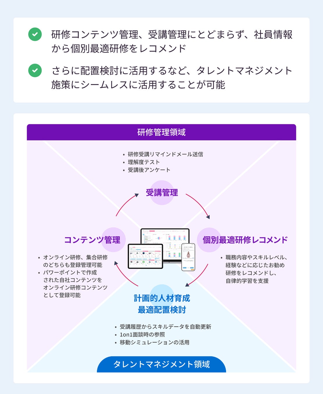タレントパレットの研修管理機能では、「コンテンツの作成」「受講予約管理」「eラーニング受講」「集合研修・社外研修受講管理」「受講状況モニタリング」など、社員の学習を支援する全ての機能が搭載されていますが、タレントパレットならではの強みとして、社員の目指すキャリアや習熟度に合わせ効果的な研修コンテンツを一人一人に自動的に推奨する機能(アダプティブ・ラーニング機能)や、研修結果と様々な人材情報を組み合わせて分析をすることで、研修効果のあった人材の抽出や、より効果の高い研修の特定などが可能です。