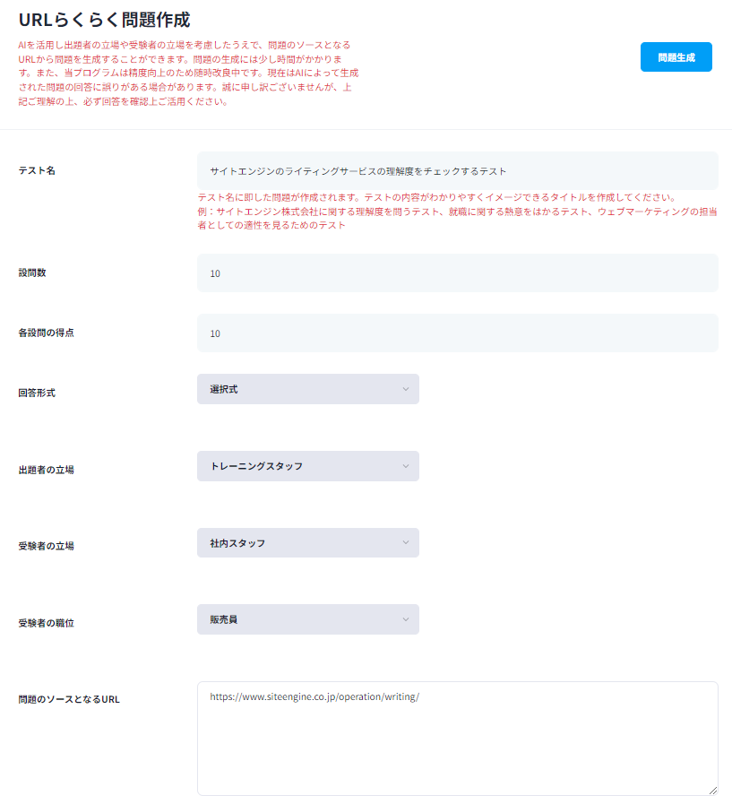 必要な情報を入力して、「問題作成」のボタンをクリックします。