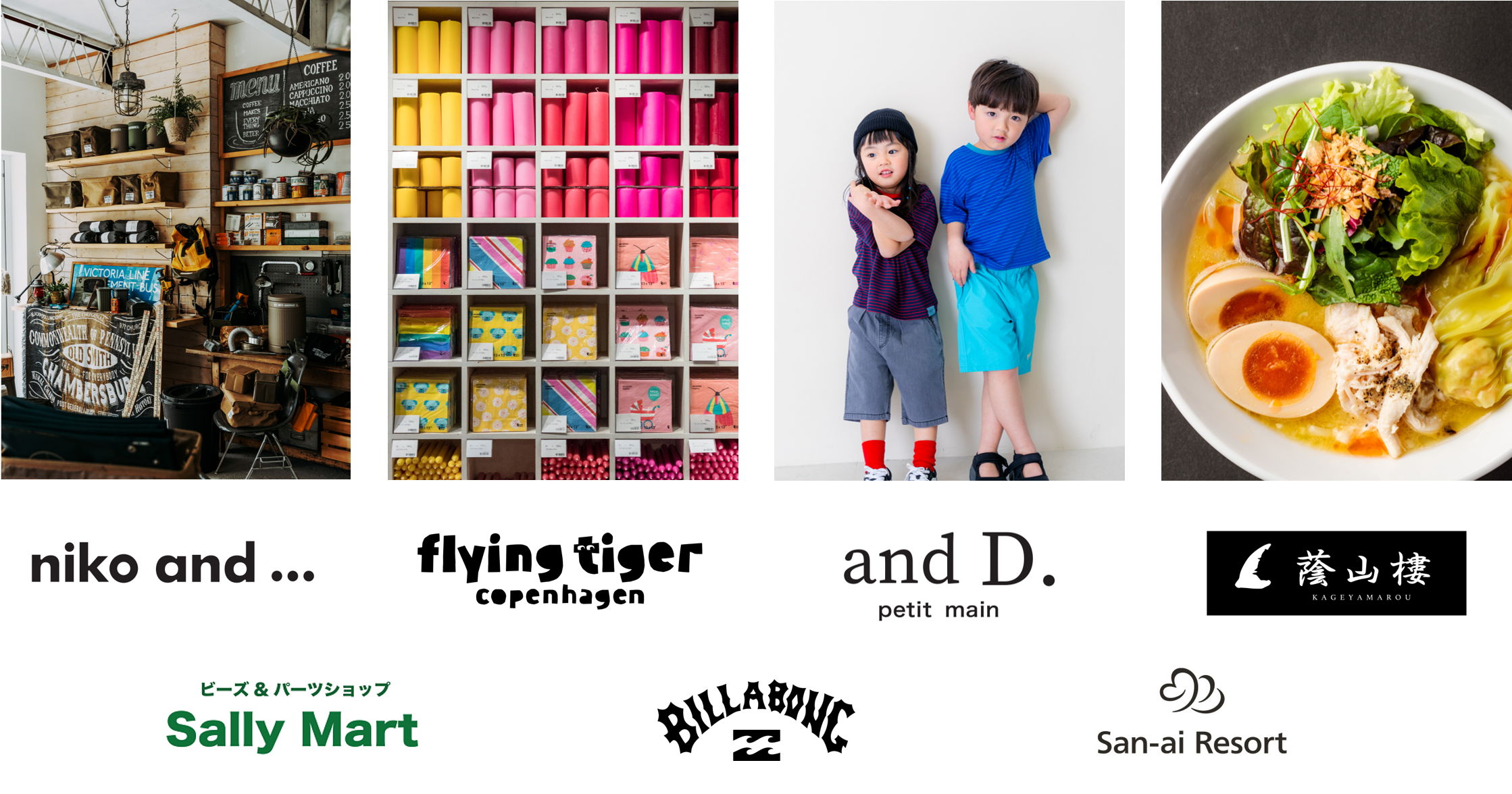 また、キッズ&ベビーゾーンにはナルミヤ・インターナショナルの新業態1号店「アンドディー.プティマイン」、コクーンキッチン(フードコート)にはフカヒレとらーめんの「蔭山樓」がエリア初出店。そのほか「サリーマート」「ビラボン」「San-ai Resort」を含む全7店舗がオープンします。