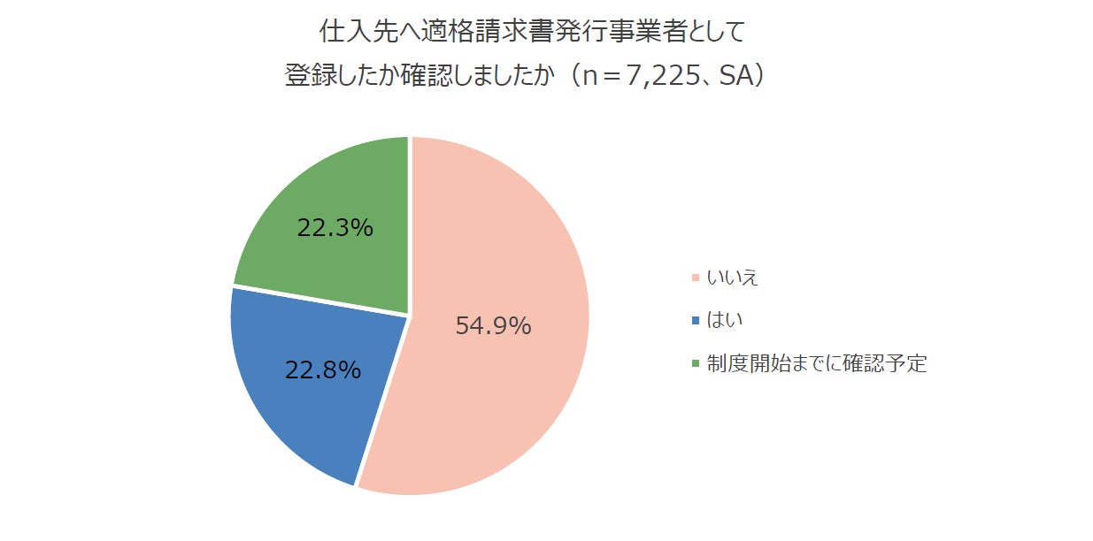 中小企業経営者7,225名に、仕入先の適格請求書発行事業者への登録状況を確認したか聞いたところ、54.9%が「いいえ」と回答し、半数以上が未確認であることが明らかになりました。