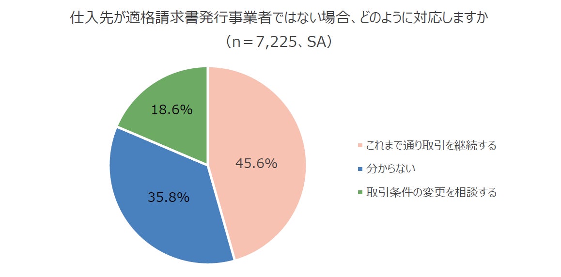 また、仕入先が適格請求書発行事業者ではない場合はどのように対応するか聞いたところ、「これまで通り取引を継続する」という回答が半数近く(45.6%)で、「取引条件の変更を相談する」は2割未満(18.6%)でした。