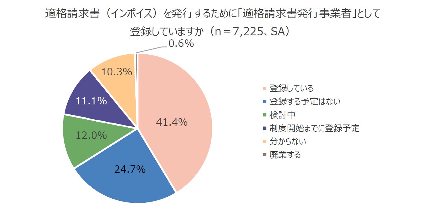 中小企業経営者7,225名に、適格請求書(インボイス)を発行するために「適格請求書発行事業者」として登録しているか聞いたところ、「登録している」が41.4%、「制度開始までに登録予定」が11.1%と、10月からの制度開始までに半数近くが登録することが分かりました。一方で、24.7%が「登録する予定はない」と回答し、約4人に1人が登録しないことが明らかになりました。