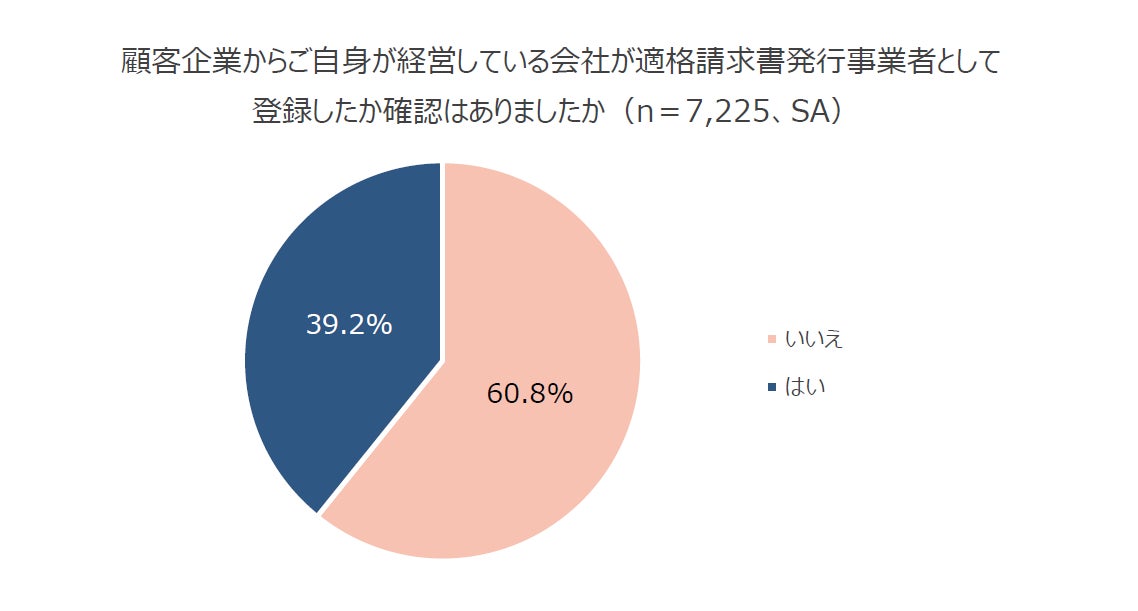 中小企業経営者7,225名に、顧客企業からご自身が経営している会社が適格請求書発行事業者として登録したか確認されたか聞いたところ、「はい」と回答したのは約4割(39.2%)で約6割(60.8%)は現時点では確認されていない状況でした。