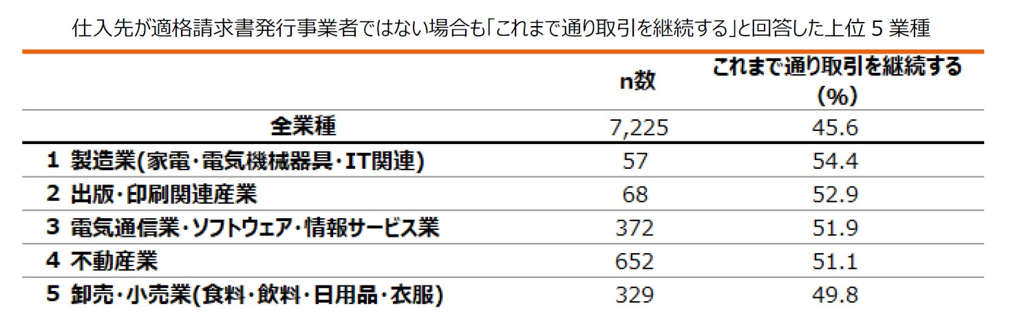 仕入先が適格請求書発行事業者ではない場合も「これまで通り取引を継続する」という回答を業種別に見ると、「製造業(家電・電気機械器具・IT関連)」(54.4%)が最も多く、「出版・印刷関連産業」(52.9%)、「電気通信業・ソフトウェア・情報サービス業」(51.9%)と続きました。
