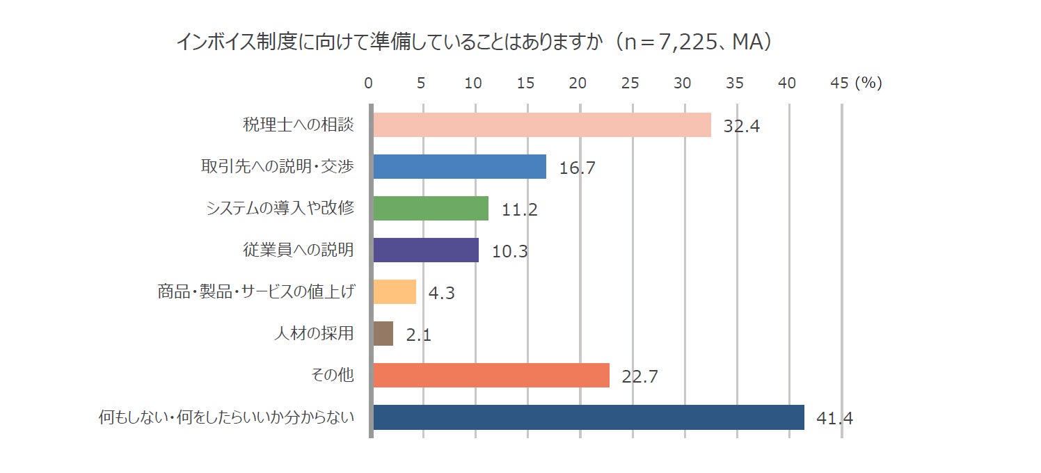 また、インボイス制度に向けて準備していることはあるか聞いたところ、「税理士への相談」(32.4%)や「取引先への説明・交渉」(16.7%)が多い結果となりました。一方で「何もしない・何をしたらいいか分からない」は41.4%でした。