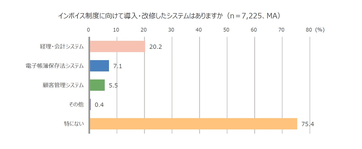 さらに、インボイス制度に向けて導入・改修したシステムはあるか聞いたところ、75.4%が「特にない」と回答しました。また、導入・改修したシステムで最も多かったのは「経理・会計システム」で20.2%でした。