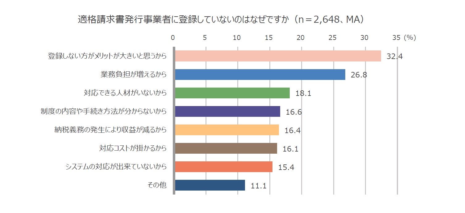 適格請求書発行事業者として「登録する予定はない」「検討中」と回答した2,648名に、なぜ適格請求書発行事業者に登録していないのか聞いたところ、最多は「登録しない方がメリットが大きいと思うから」(32.4%)で、次いで「業務負担が増えるから」(26.8%)、「対応できる人材がいないから」(18.1%)でした。また、「制度の内容や手続き方法が分からないから」という回答が16.6%で、インボイス制度に対応できる人材が居らず手続き方法がわからないことも登録していない理由の一つだと考えられます。