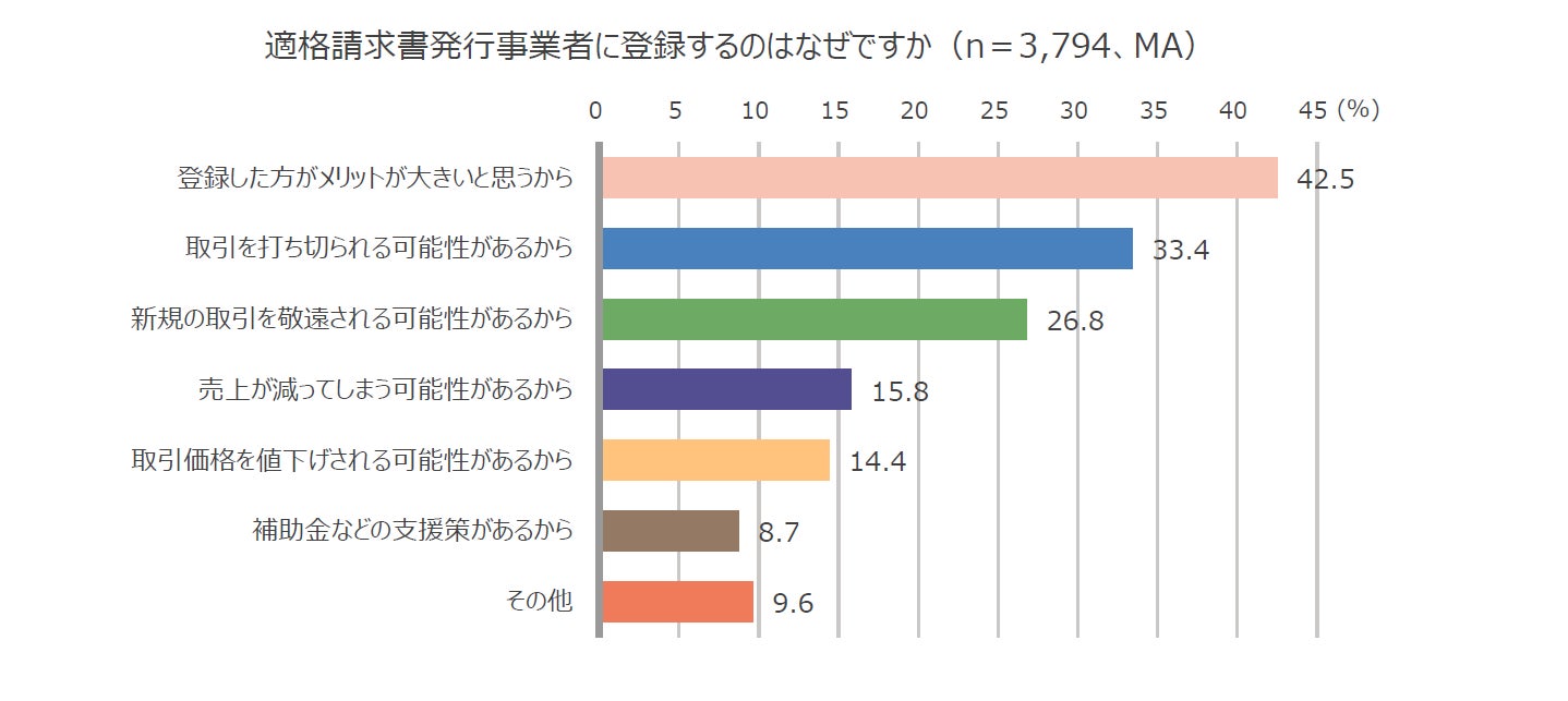 適格請求書発行事業者へ登録する理由は、「取引を打ち切られる可能性があるから」(33.4%)、「新規の取引を敬遠される可能性があるから」(26.8%)という回答が上位に