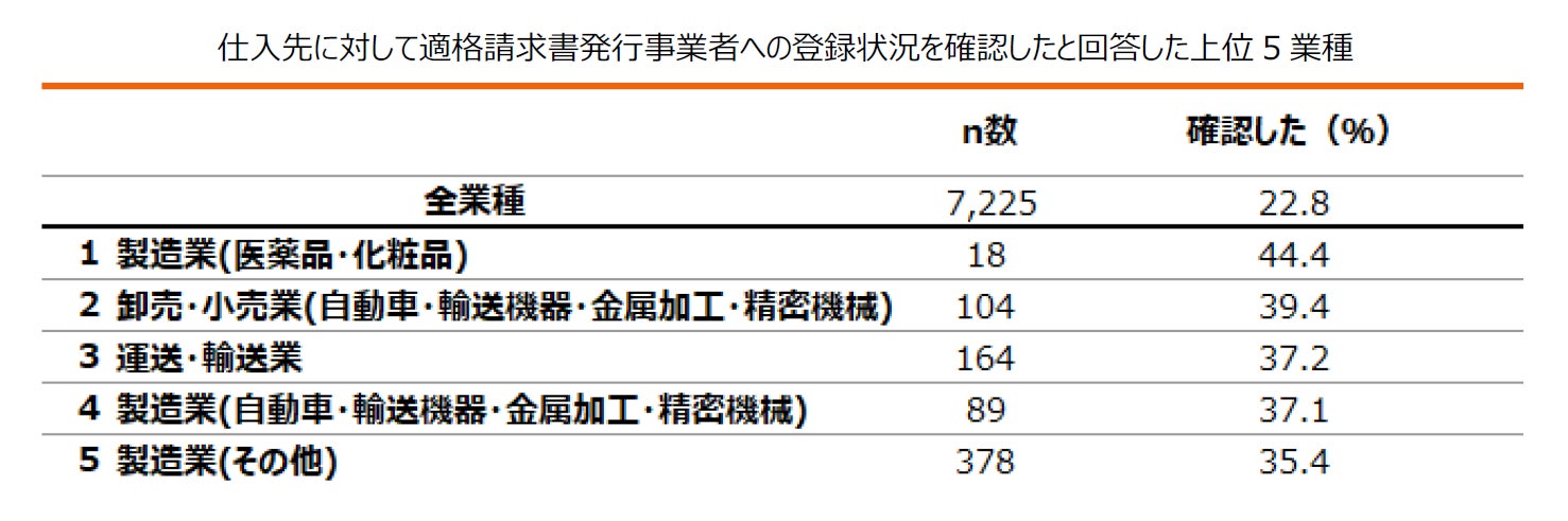 仕入先に対して適格請求書発行事業者への登録状況を確認したという回答率を業種別に見ると、最も多いのは「製造業(医薬品・化粧品)」(44.4%)で、次いで「卸売・小売業(自動車・輸送機器・金属加工・精密機械)」(39.4%)、「運送・輸送業」(37.2%)でした。