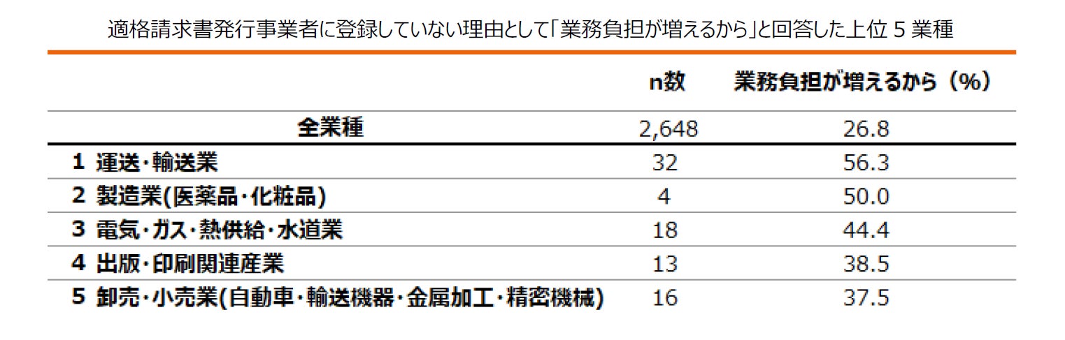 適格請求書発行事業者へ登録していない理由は、「業務負担が増えるから」(26.8%)、「対応できる人材がいないから」(18.1%)。「業務負担が増えるから」の業種別の回答率は運送・輸送業(56.3%)が最多