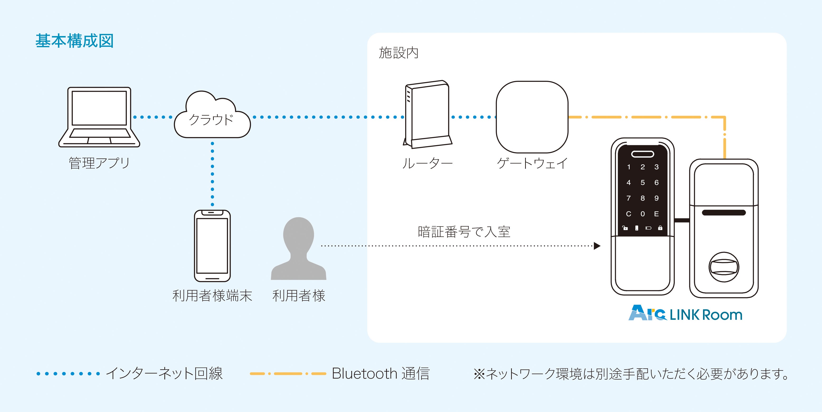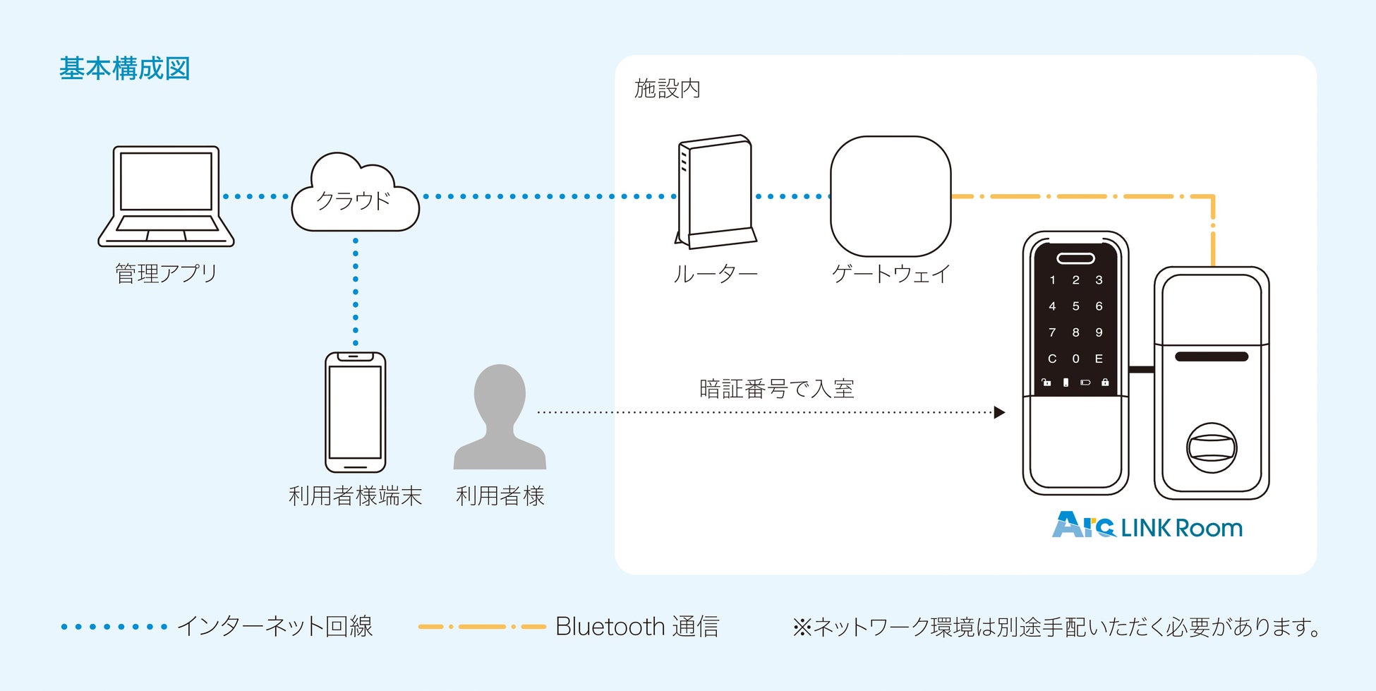 「Arc LINK Room」は、施設予約情報と連動して、クラウド上で鍵の発行・管理を行えるスマートロックシステムです。時限式暗証番号やICカードを用いた認証方式に対応し、入退室の履歴はリアルタイムで取得ができ、CSV出力も可能です。