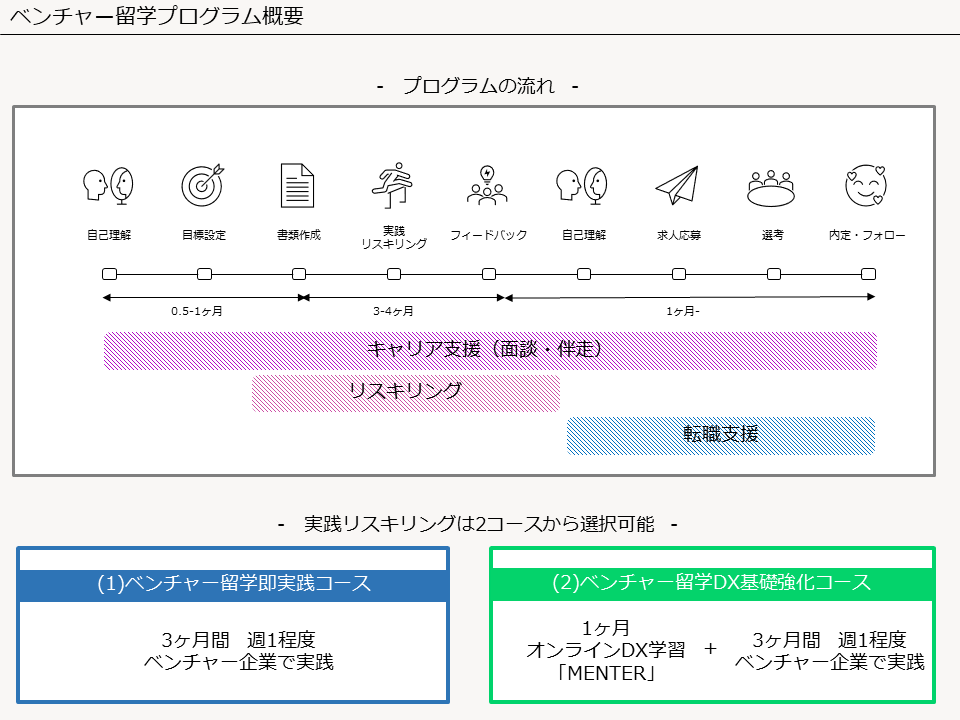 「ベンチャー留学」は、キャリア相談、ベンチャー企業での実践経験(リスキリング)、転職を一気通貫で支援するプログラムで、即実践とDX基礎強化の2コースを用意。DX基礎強化コースは、デジタルに強い人材を育成するオンライン学習サービス 「MENTER(https://menter.jp/)」を提供するWHITE株式会社(神奈川県横浜市、代表取締役社長 横山 隆)と提携し、DXスキルの強化に特化しています。