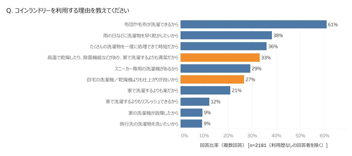 4. 利用理由では「大物洗濯」「時短」に加え、33%が「家庭よりも清潔」、27%が家庭よりも「仕上がりの良い」を理由に