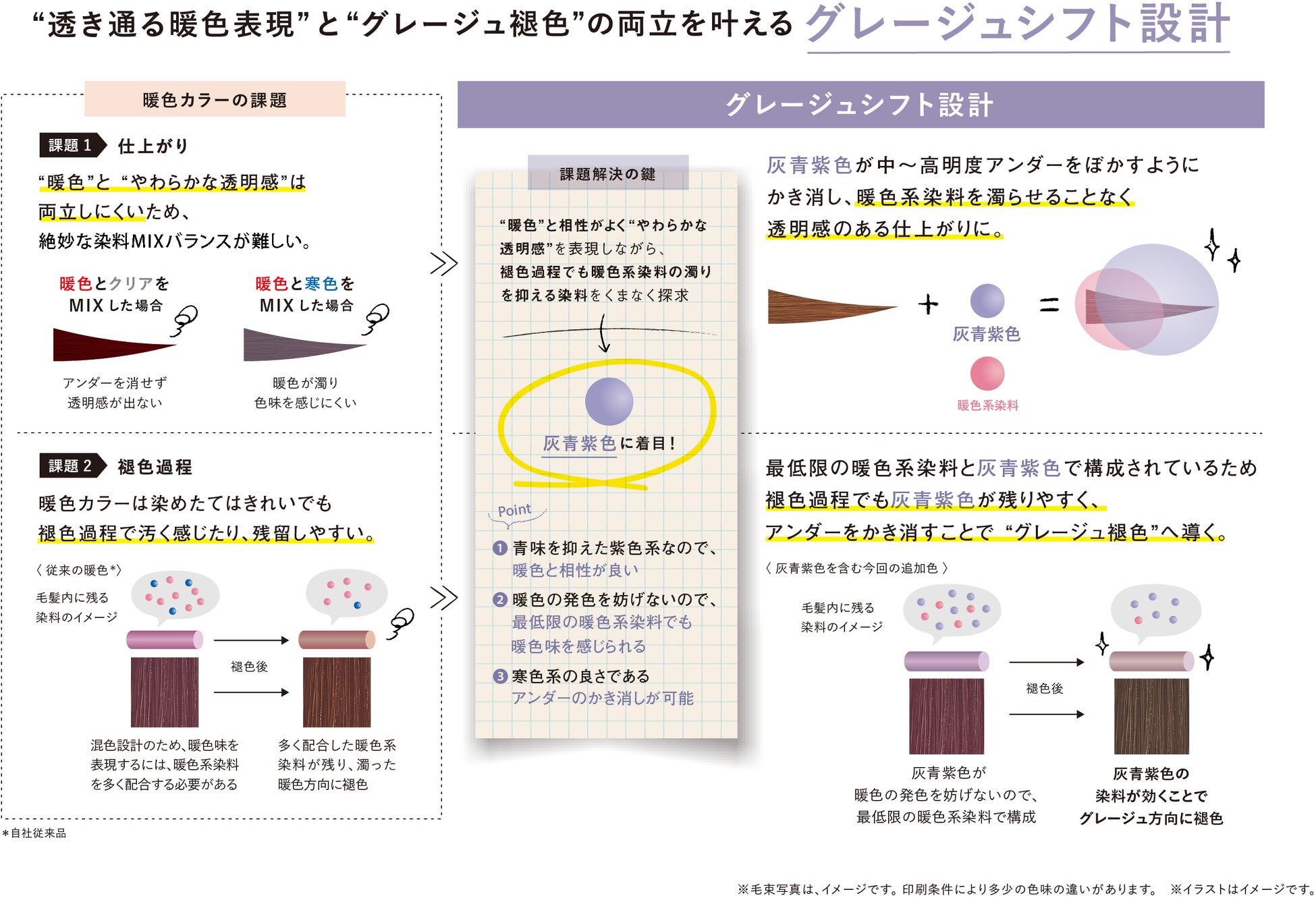 暖色カラーにおいて生じる①仕上がりのくすみや濁り、②褪色過程での暖色方向への褪色、といった課題に対して、「グレージュシフト設計」を確立。“灰青紫色”に着目した独自の設計により、“透き通る暖色表現”と“グレージュ褪色”の両立を実現します。