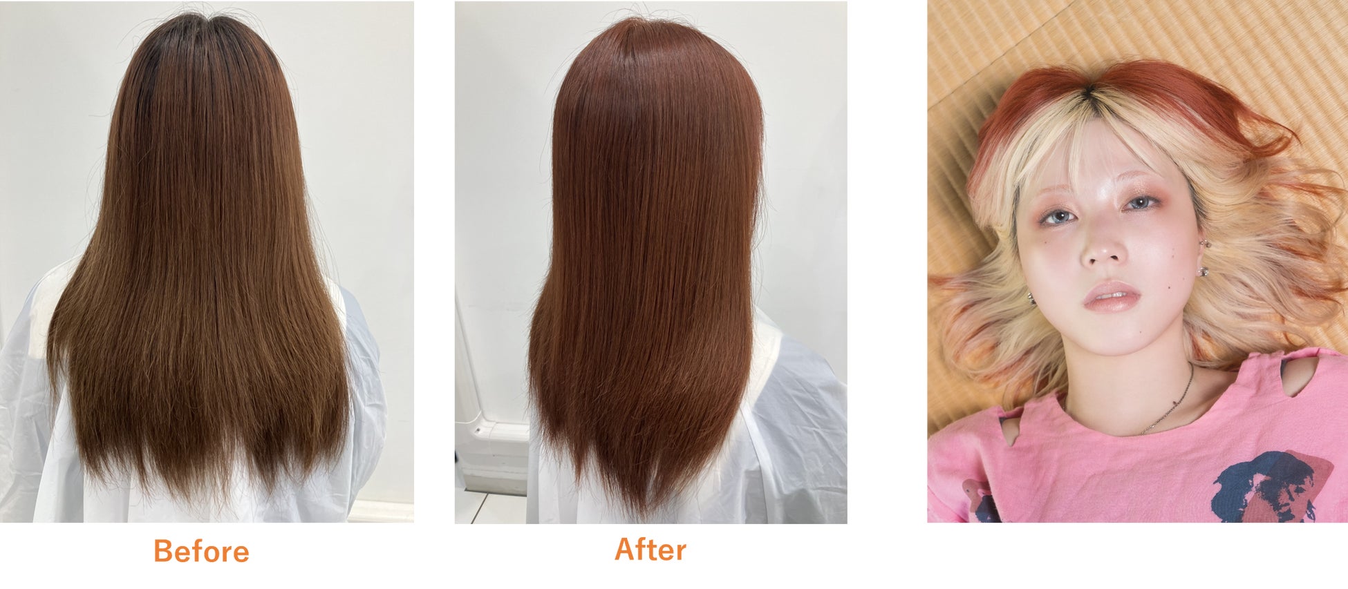 一度の施術で複数回ハイライトを入れたようなデザインを実現します。また、「ルベライト」と「オレンジカーネリアン」2色を使用することで、褪色していく過程でも、ナチュラルなグラデーションが続き、“どの瞬間でも美しいデザイン”が完成します。