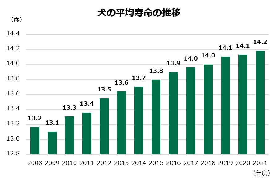 ※:2008年4月1日~2022年3月31日までに、アニコム損保のペット保険の契約を開始した犬および猫を対象に、年度ごとに各年齢での契約頭数と、それらのうち死亡解約の届け出があった頭数を集計し、カレント生命表を作成。0歳時点での平均余命を平均寿命とした。