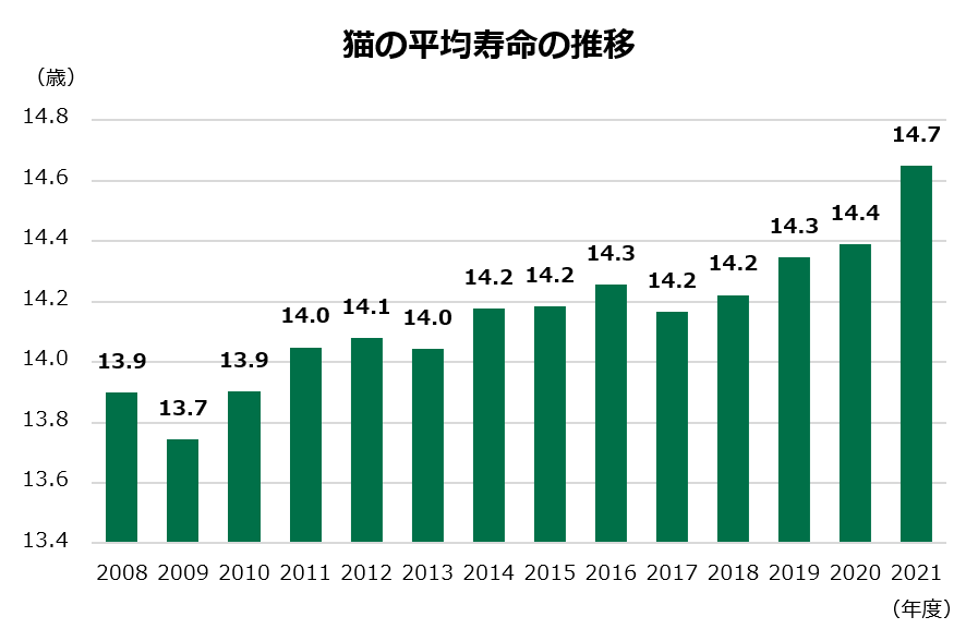 犬と猫の平均寿命を調査した結果、犬は 14.2歳、猫は14.7歳でした。いずれも過去最長(当社が調査を開始した2008年以降のデータによる)であった昨年の調査から更に延び、特に猫は昨年と比べて+0.3歳と、過去10年のうちで最も延びています。