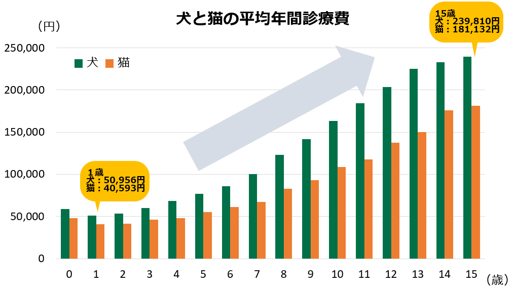平均年間診療費は、1歳から15歳で犬は4.7倍・猫は4.5倍に。高齢どうぶつにも着目