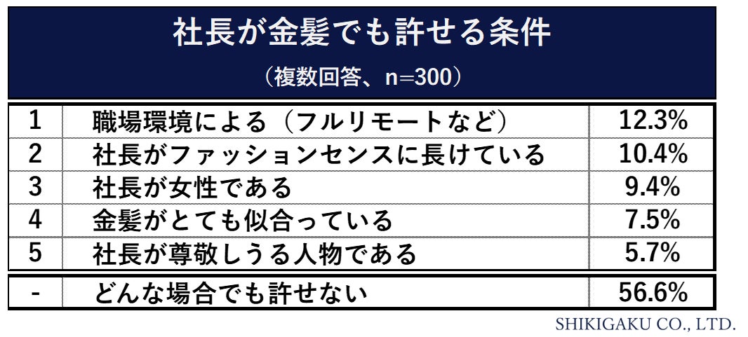 その内訳をみると、「職場環境による(フルリモートなど)」12.3%、「社長がファッションセンスに長けている」10.4%などが上位に挙がりましたが、最も多かったのは「どんな場合でも許せない」で56.6%でした。やはり、社長の金髪にそもそもの拒否反応がある方は、どんな条件であっても「許せない」ということでした。