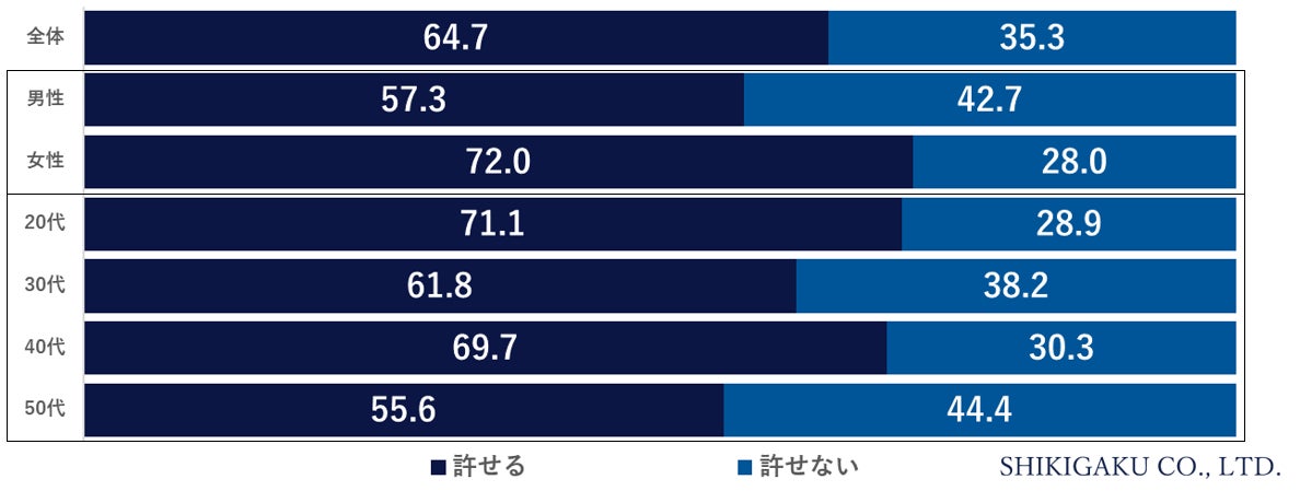 前問で染髪不可の規定がない、且つ社長が金髪ではない(過去も含む)と回答した方に「会社の社長が金髪になって現れた場合、許せるか」について聞いたところ、「許せる」は意外にも64.7%と過半数を上回りました。年代別で見ると、20代の「許せる」が71.1%で、50代は55.6%。男女別では、男性の「許せる」が57.3%、女性が72.0%と、若い世代や女性の方が、社長の容姿についてより寛容であることがわかりました。
