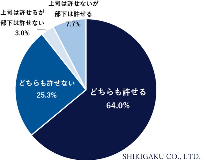 では“社長”ではなく、“部下”や“上司”が「金髪」だった場合、その許容度合に変化はあるのでしょうか。最も多かったのは、部下も上司も「どちらも許せる」が64.0%、次に「どちらも許せない」25.3%でした。社長の金髪を許せるという方も64%だったため、それが部下や上司であろうと、金髪への許容度合に変化はないようでした。