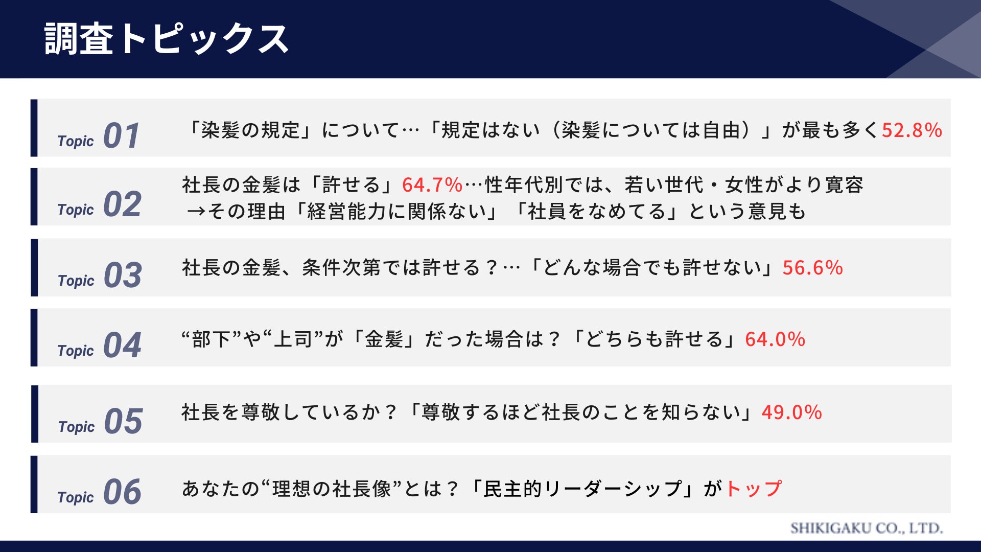 「識学」を使った経営・組織コンサルティングや従業員向け研修を展開する株式会社識学(本社:東京都品川区、代表取締役社長:安藤広大)は、2024年11月8日(金)「“社長の金髪”に関する調査」を行いました。