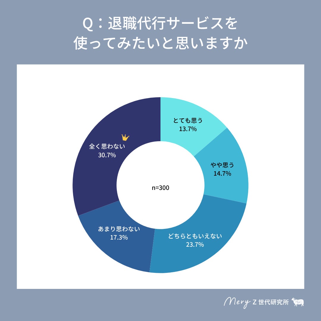 これまでに退職(転職)を経験したことがあるZ世代300人に「今後、退職の際に退職代行サービスを使ってみたいと思うか」を聞いたところ、28.3%が「使ってみたい(「とても思う」「やや思う」)」と回答しました。