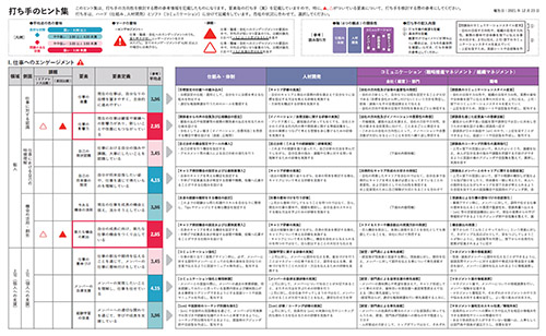 サーベイ結果をもとにした課題仮説の提示とともに、一般的な施策内容を参照できるヒント集をご提供します。人事や経営トップ層が、自社・自組織の課題の把握にとどまらず、課題に対応する効果的な施策を検討する際の参考材料となります。