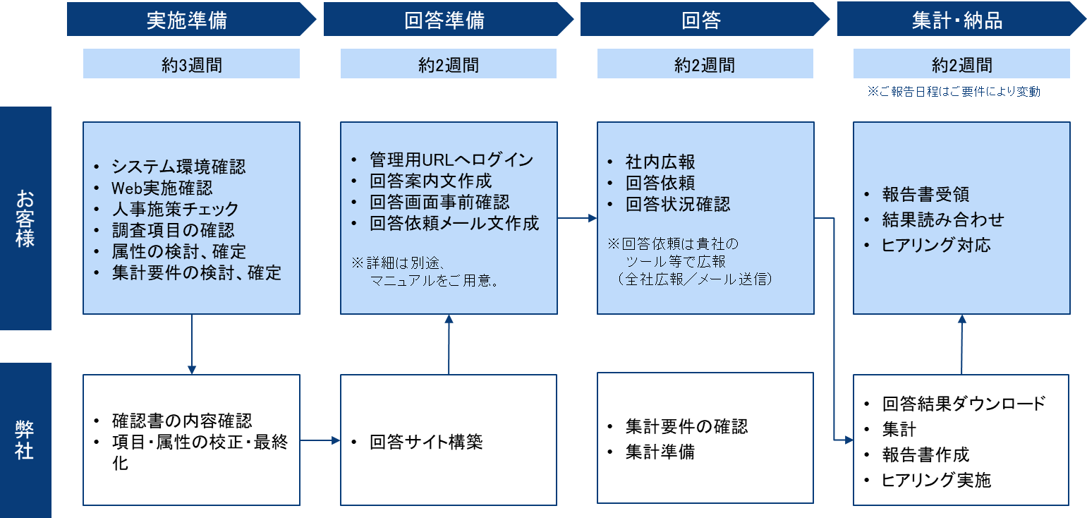 - 実施準備~集計・納品までを専門スタッフが一貫してサポートします。