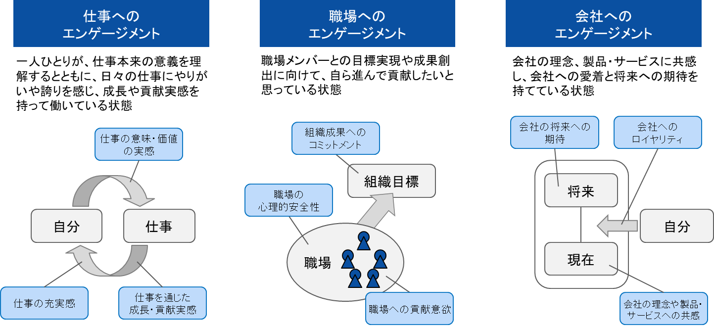 一般的に提唱されるエンゲージメントの概念を参考に、エンゲージメント向上の対象を「仕事」「職場」「会社」に分け、3つのエンゲージメントとして捉えました。一般的な概念を参考にしつつも、働く人たちの価値観や就業感の変化を捉えた今日的な項目になっており、長年人と組織の課題解決において50年以上の実績を持つ当社ならではのエンゲージメントの測定モデルになっています。