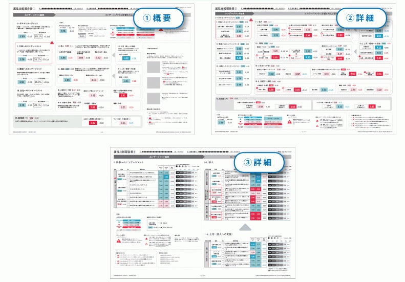 全体感の把握~詳細の確認まで、確認したいレベルに適した3種類の報告書やエンゲージメント状態をランキング形式で確認できるアウトプットが納品されます。