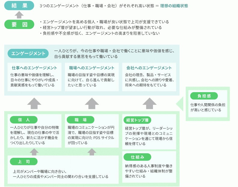「仕事」「職場」「会社」へのエンゲージメントとその要因を測定することで、バランスよくエンゲージメント状態を把握し、それぞれのエンゲージメントを高める要因を探ることができます。
