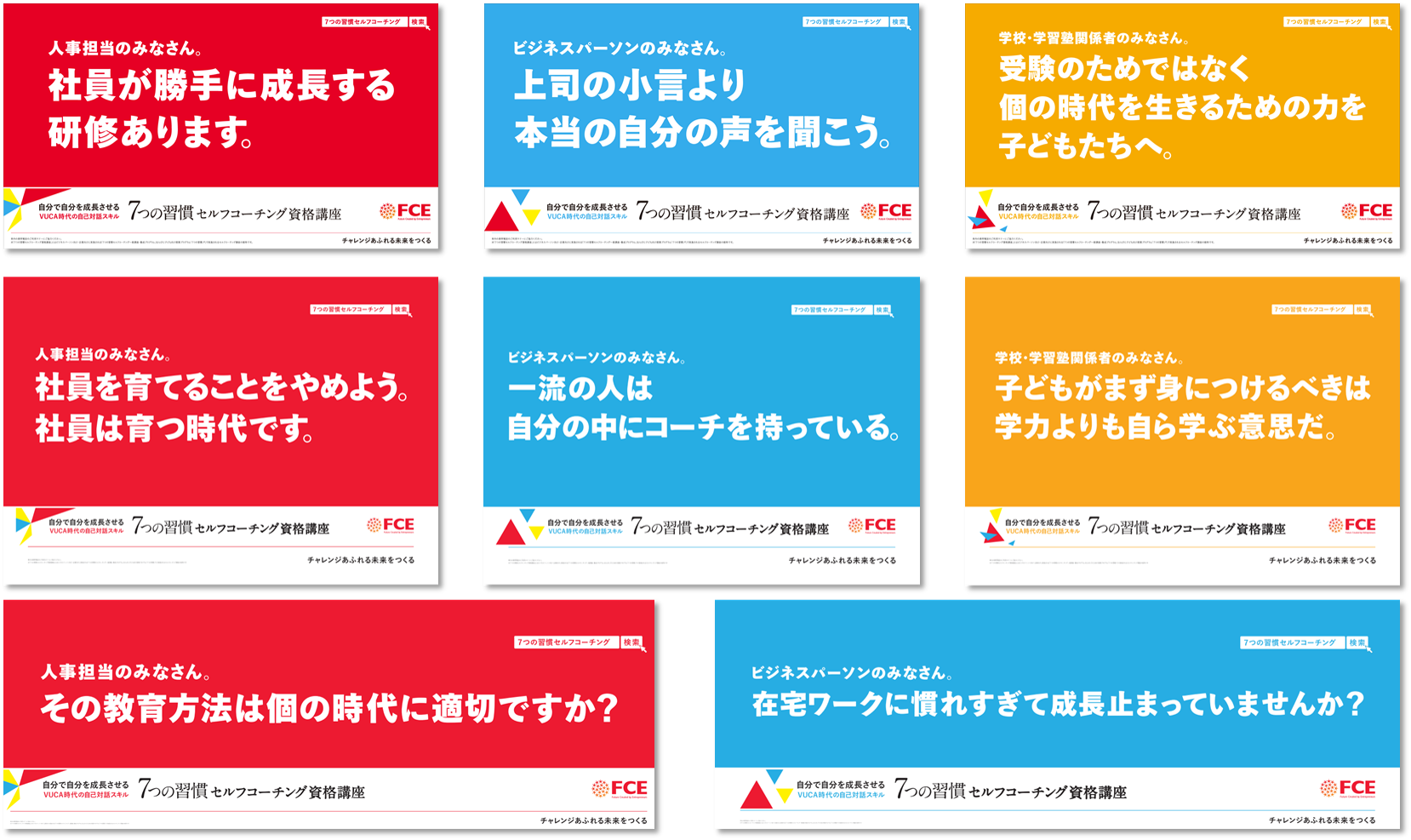 世界的ベストセラー『7つの習慣』出版社である株式会社FCE パブリッシング(本社:東京都新宿区、代表取締役:正木晃、以下FCEパブリッシング)は、2022年9月19日から9月25日までの7日間、首都圏のJR東日本及びりんかい線、つくばエクスプレスの車両にて、自分で自分を成長させるVUCA時代の自己対話スキル「7つの習慣セルフコーチング資格講座」に関する交通広告を掲出いたします。働き方などが変わり、これまで以上に「個の力」の向上が求められる「この時代」に必要な教育や人材育成、ビジネスパーソンとしてのあり方とは何か?について問いかけるメッセージ広告となります。
