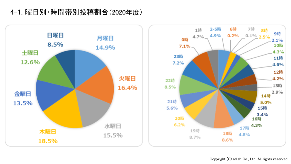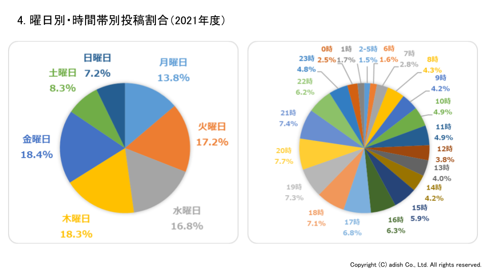 曜日別の投稿は、平日終盤の木曜日(18.3%)と金曜日(18.4%)の合計で36.7%を占める結果となり、その週にあったことを週の終わりにまとめて投稿するケースが多く見受けられます(図4. 曜日別・時間帯別投稿割合(2021年度)。