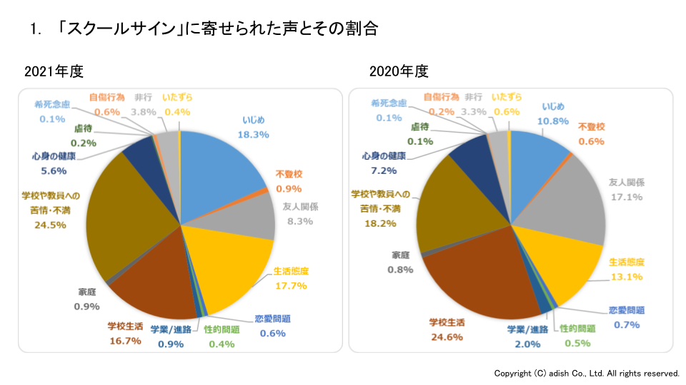 アディッシュ、いじめ匿名連絡サイト「スクールサイン」の2021年度集計結果を発表。2020年度からの投稿増加率が最も高かった声は「いじめ」